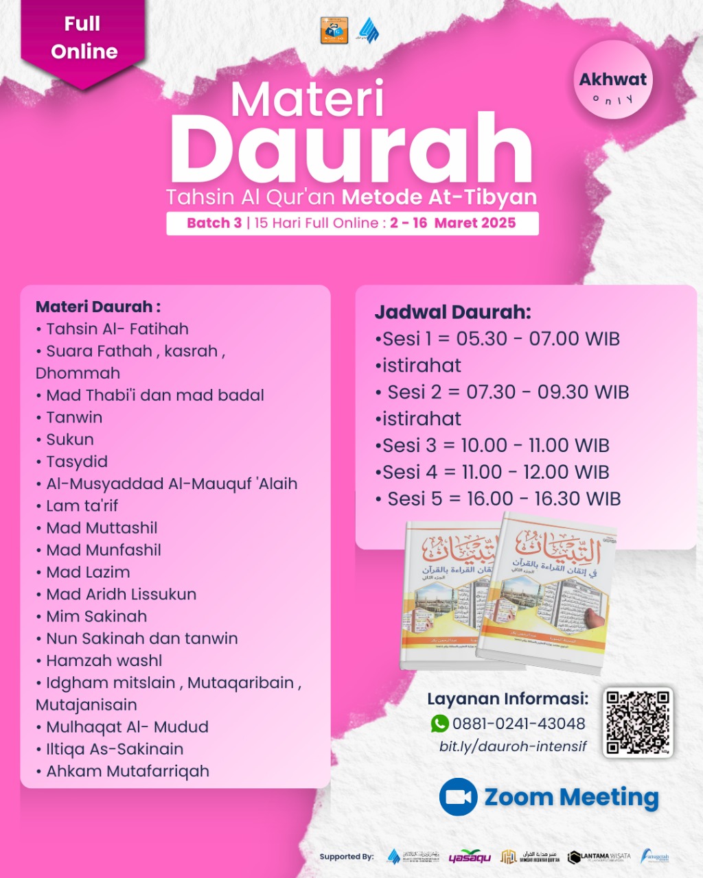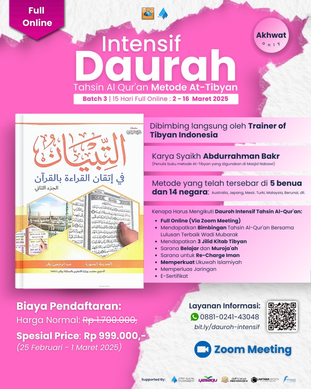 Dauroh Tahsin Al-Qur’an dengan metode At-Tibyan adalah program pelatihan untuk meningkatkan kualitas bacaan Al-Qur’an yang telah digunakan di 5 benua dan 14 negara, termasuk Saudi Arabia, Australia, Jepang, Mesir, Turki, Malaysia, Brunei, dan lainnya. Program ini dibimbing langsung oleh Trainer of Tibyan Indonesia dalam format full online selama 15 hari. Metode ini, yang dirancang oleh Syaikh Abdurrahman Bakr, penulis buku metode At-Tibyan yang diterapkan di Masjid Nabawi, bertujuan untuk memperbaiki cara baca dan tajwid Al-Qur’an dengan pendekatan yang efektif dan mudah dipahami. Melalui pelatihan ini, peserta akan memperoleh pemahaman mendalam mengenai aturan tajwid yang benar, sehingga dapat membaca Al-Qur’an dengan baik dan sesuai dengan kaidah yang telah ditetapkan.